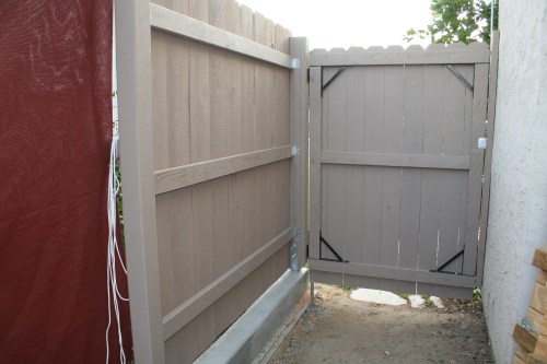 It is a fine 6-foot side yard privacy fence atop a well-built concrete knee wall that keeps the wooden fence above the grade of the neighbors’ yard, which varies from 7″ higher than our property at the front to 16″ at the back. The wall is 53-feet long, supported by an 8″ x10″ footer reinforced with rebar. That baby ain’t going anywhere. I built it for eternity.