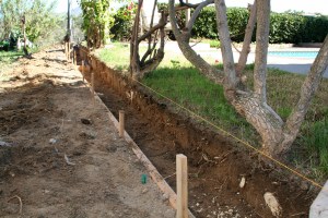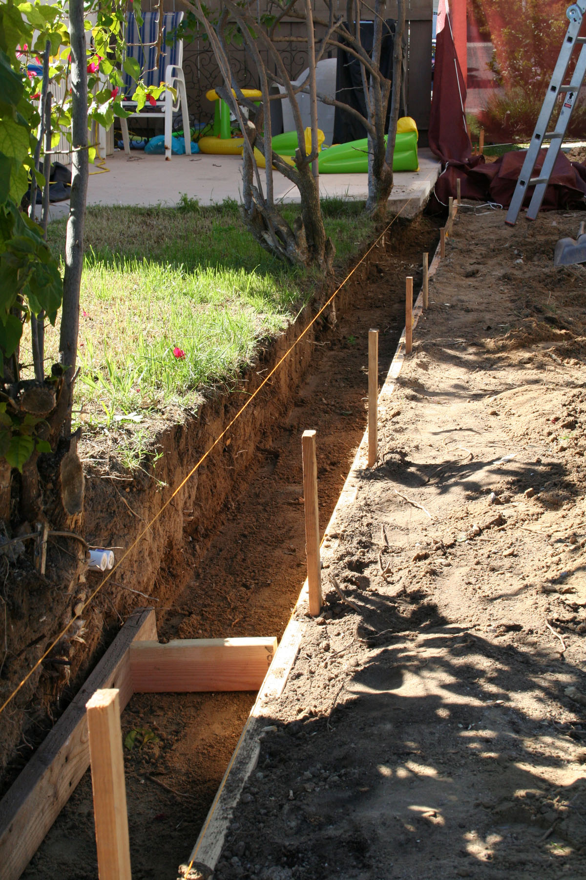 Then the digging commenced. I planned to form a 10″ x 8″ footer centered on the property line, and once the fence was down it became clear just how much excavation that would require. Plus, the ancient bougainvillea bushes on the neighbor’s side had been planted right next to the old fence line and were terrifically overgrown, so they had to be radically trimmed (ouch!) and as the footer trench was excavated, roots sawn through and removed. Lotsa roots.