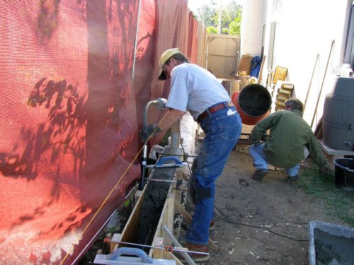 One of the biggest challenges I encountered was working around the edge of the 16-foot slab that the previous neighbors had poured right up to the old fence. We called a friend over to cut it even with the property line and I poured the footer underneath it, thinking I could somehow form the wall around the dang thing and incorporate the edge within the new concrete. As I got closer to wall construction I decided the slab needed cut back again, and the new cut edge became one side of the form for the first, low wall section. Of course, I had to buy a honkin’ saw to get the job done. Every girl needs a worm-drive Milwaukee saw with diamond blade, don’t you think?