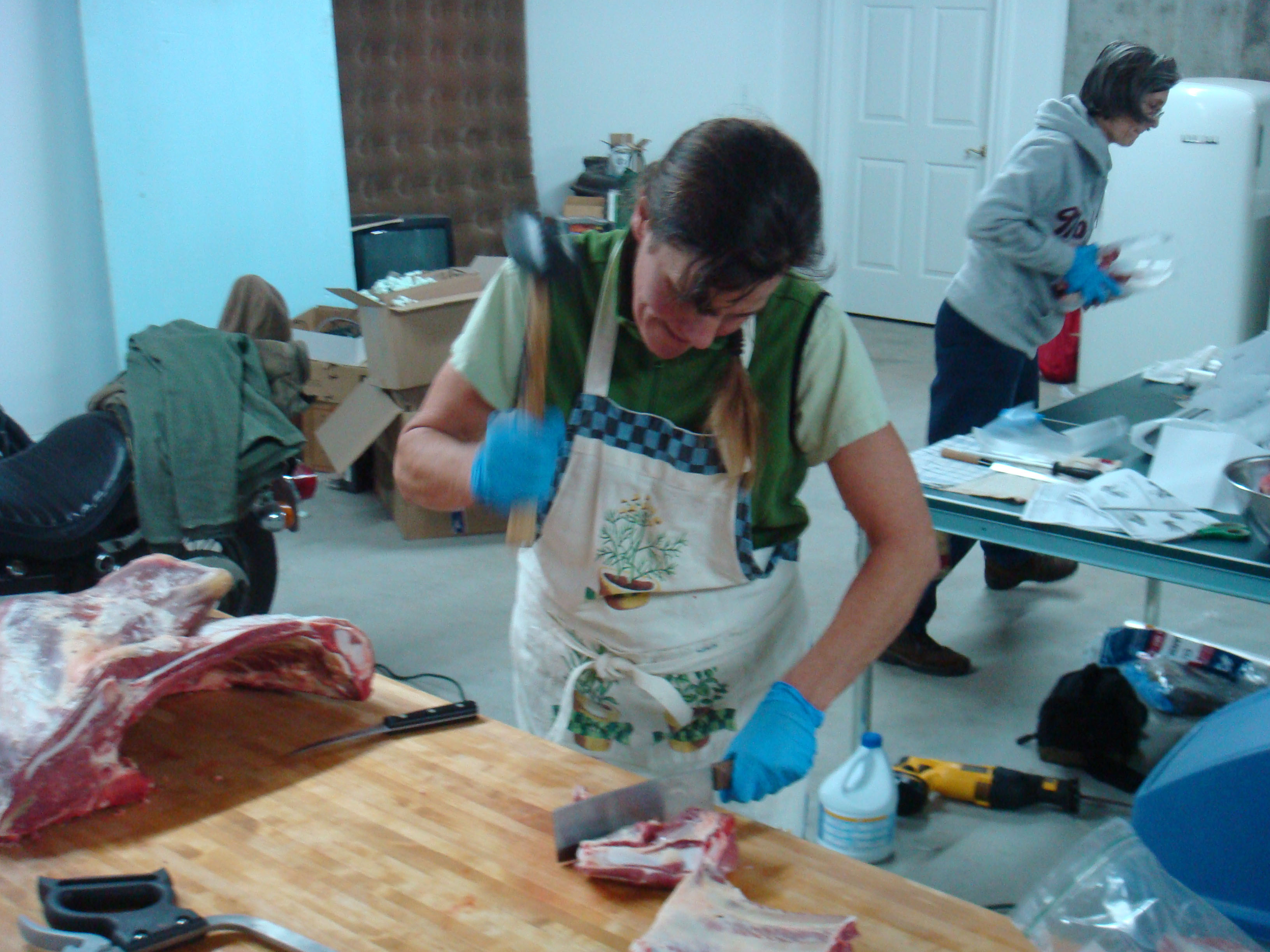 Again, this was the first time for both of us to cut up an animal of this size. Books and illustrations make the cuts look simple and easy. They are not. We’ll need to do more butchering to hone our skills, and I’ve ordered an instructional DVD to help with identifying the anatomy sections and where the major cuts are made. It was confusing at times, but we persevered, telling ourselves that even gooned-up cuts can be made into ground beef. We cut a lot of great-looking roasts and steaks out of it, though, despite our lack of skill and experience.
